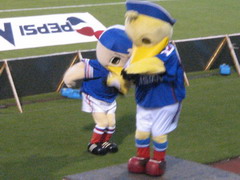 (試合前、「We are F-Marinos」で踊るマリノス君とマリノスケ)