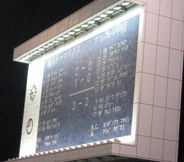 後半もずっと押し込まれる展開だったが、甲府も退場者(石原)を出し、人数がイーブンに戻ると、マリノスも攻勢に転じる。山瀬の突破により得たPKを松田が決め、結局3-0で勝利。