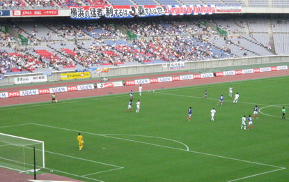 試合開始早々、甲府の攻撃サッカーに受身に立たされ、押し込まれる展開が続く。なんとか、ふんばってほしいと思っていたら、甲府に思いもかけぬミスが。GKに対してのバックパスのはずがなんと無人のゴールへ。なんともラッキーな先制点がマリノスに。